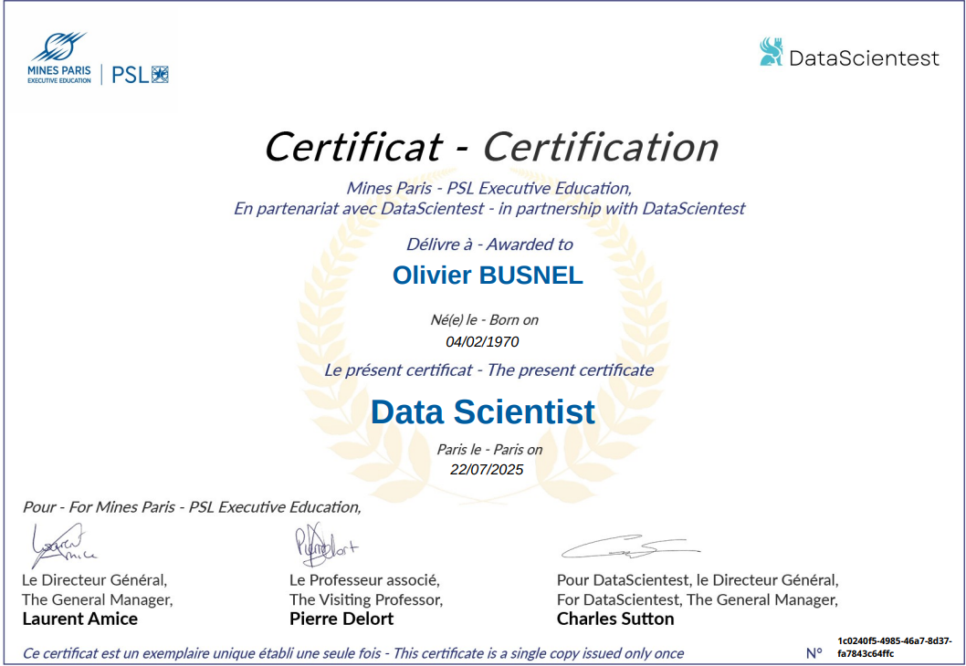 Après plusieurs semaines/mois de formation, je suis fier.e de vous présenter mon Diplôme de Data Scientist obtenu grâce à DataScientest et reconnu par Mines Paris - PSL Executive Education